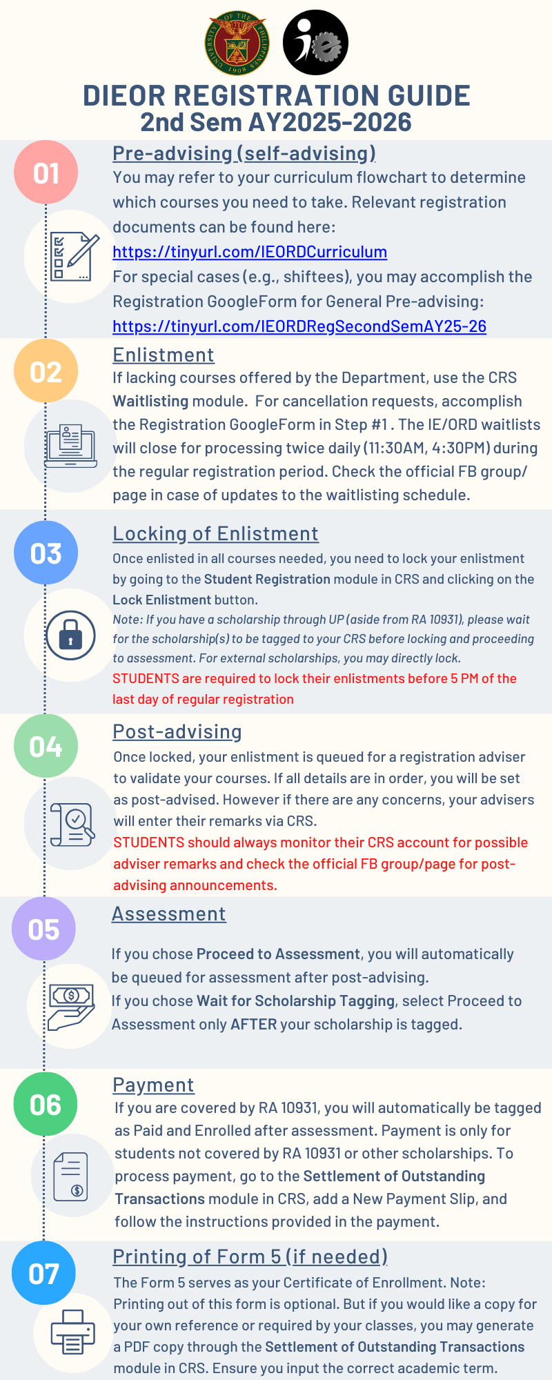 1. The Department’s Registration Google Form will ONLY accept responses during the regular registration period here: https://tinyurl.com/IEORDRegSecondSemAY25-26