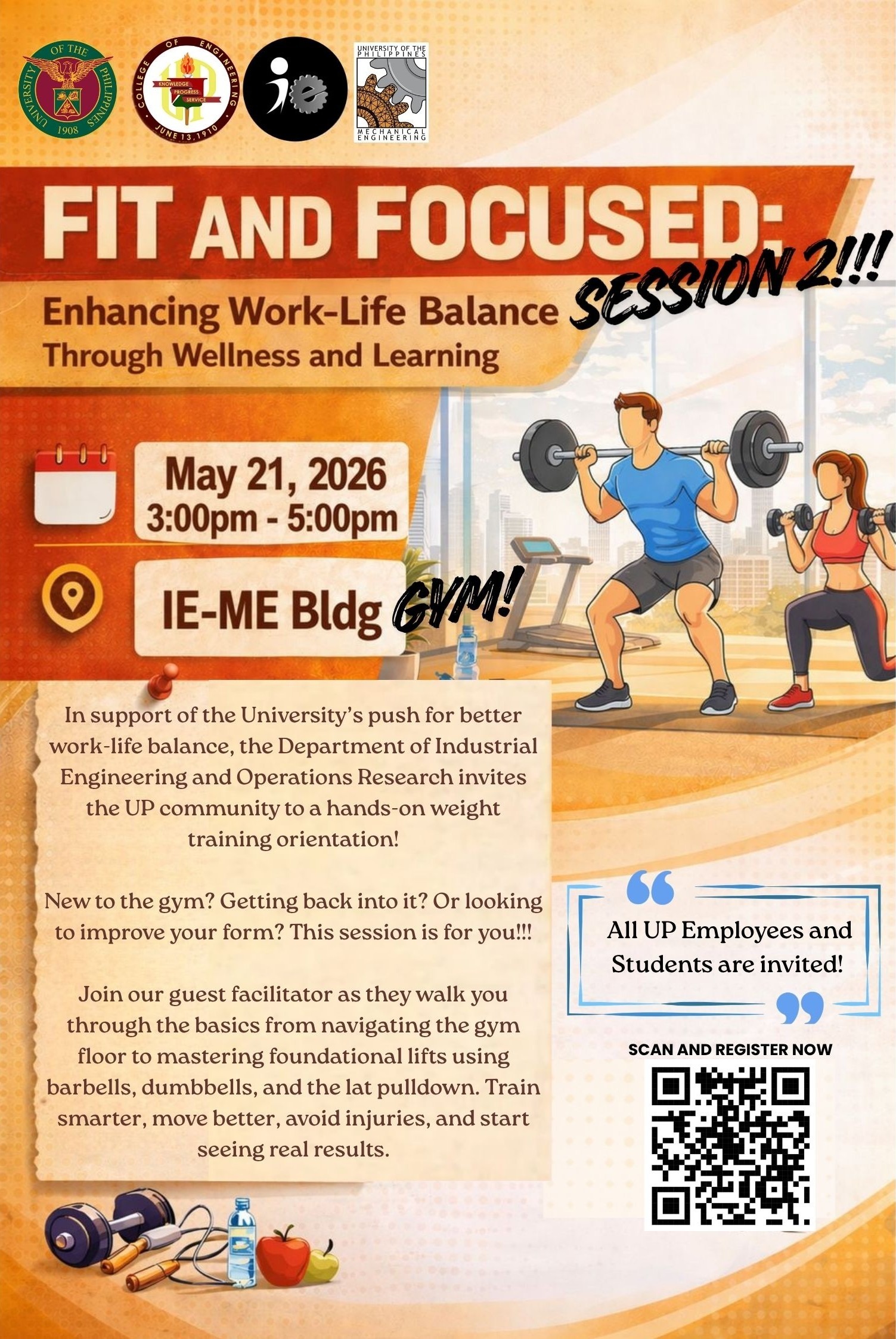 The Industrial Engineering and Operations Research Department is inviting all members of the UP Community to participate in the second installment of Fit and Focused: Enhancing Work-Life Balance Through Wellness and Learning! It will take place in the IE/ME Gym, located in the 2nd Floor of the IE/ME Building, on May 21, 2026 from 3:00 PM – 5:00 PM.